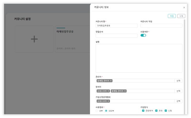 • 커뮤니티의 특성에 맞는 가입 방식(권한 부여, 초대, 신청 후 승인)을 제공합니다.