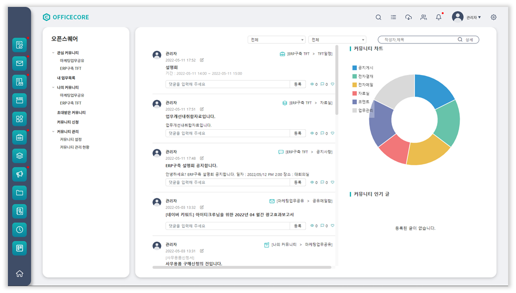 • 게시함, 자료함, 일정, 업무 관리 등의 관리 항목 추가 기능