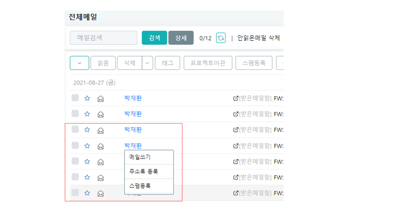 해당 이름을 클릭하면 메일쓰기, 주소록 등록, 스팸등록까지 한 번에!