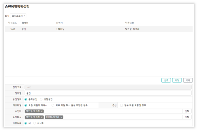 • 모든메일/특정외부주소메일 및 첨부파일 존재를 기반으로 승인여부를 설정