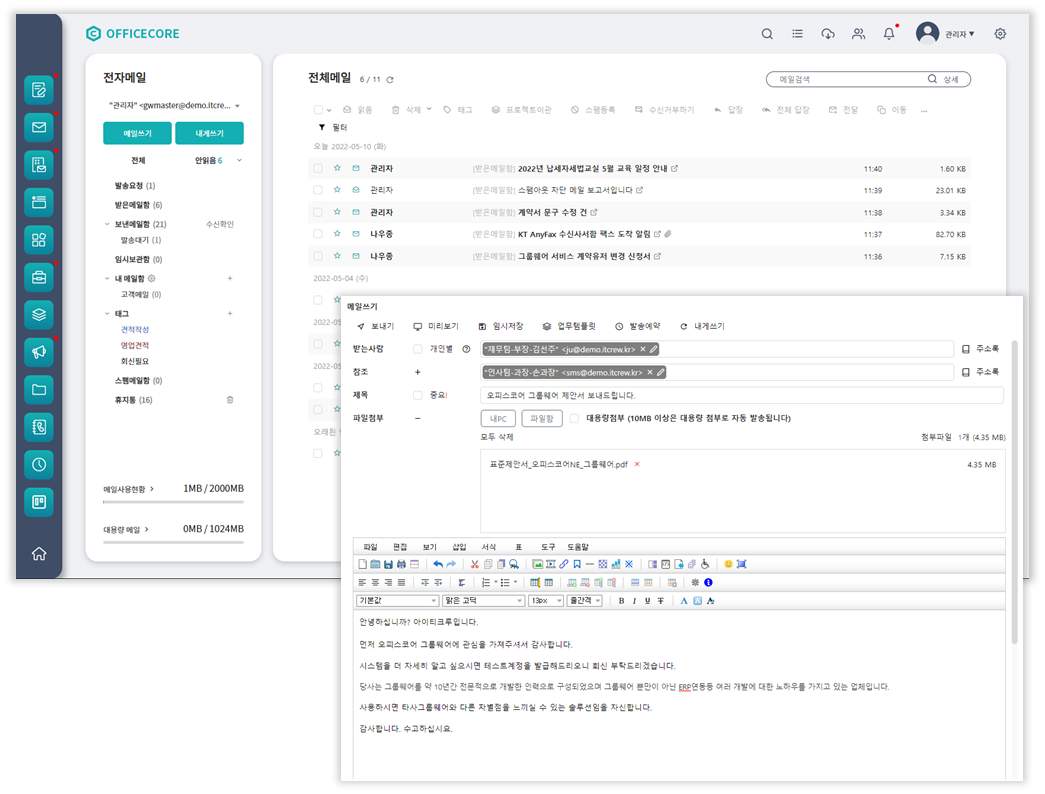 자체 기술의 메일서버로 높은 기술력을 제공하며 각종 보안 기술 지원으로 안정성있게 관리할수 있습니다.
