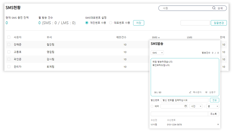 주소록 기능을 사용하면 사용자의 연락처를 관리하고 팀원들과 공유할 수 있으며, 주소록을 활용하여 간편하게 SMS를 발송하는 기능을 제공합니다.